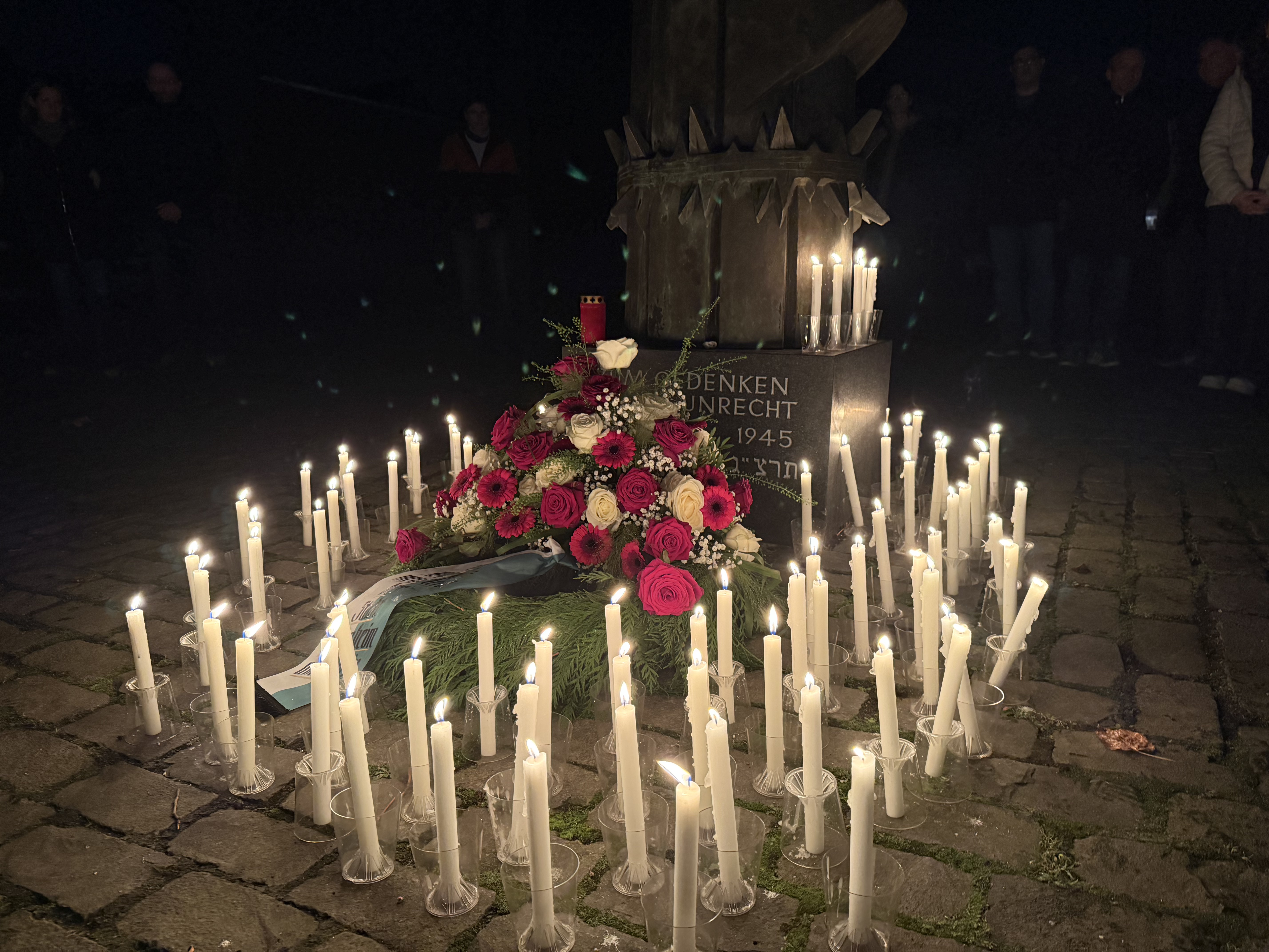 Im Anschluss versammelten sich die Teilnehmenden im stillen Gedenken am Mahnmal auf dem Kradepohl-Platz, ein Kranz wurde niedergelegt und Kerzen am Mahnmal angezündet.