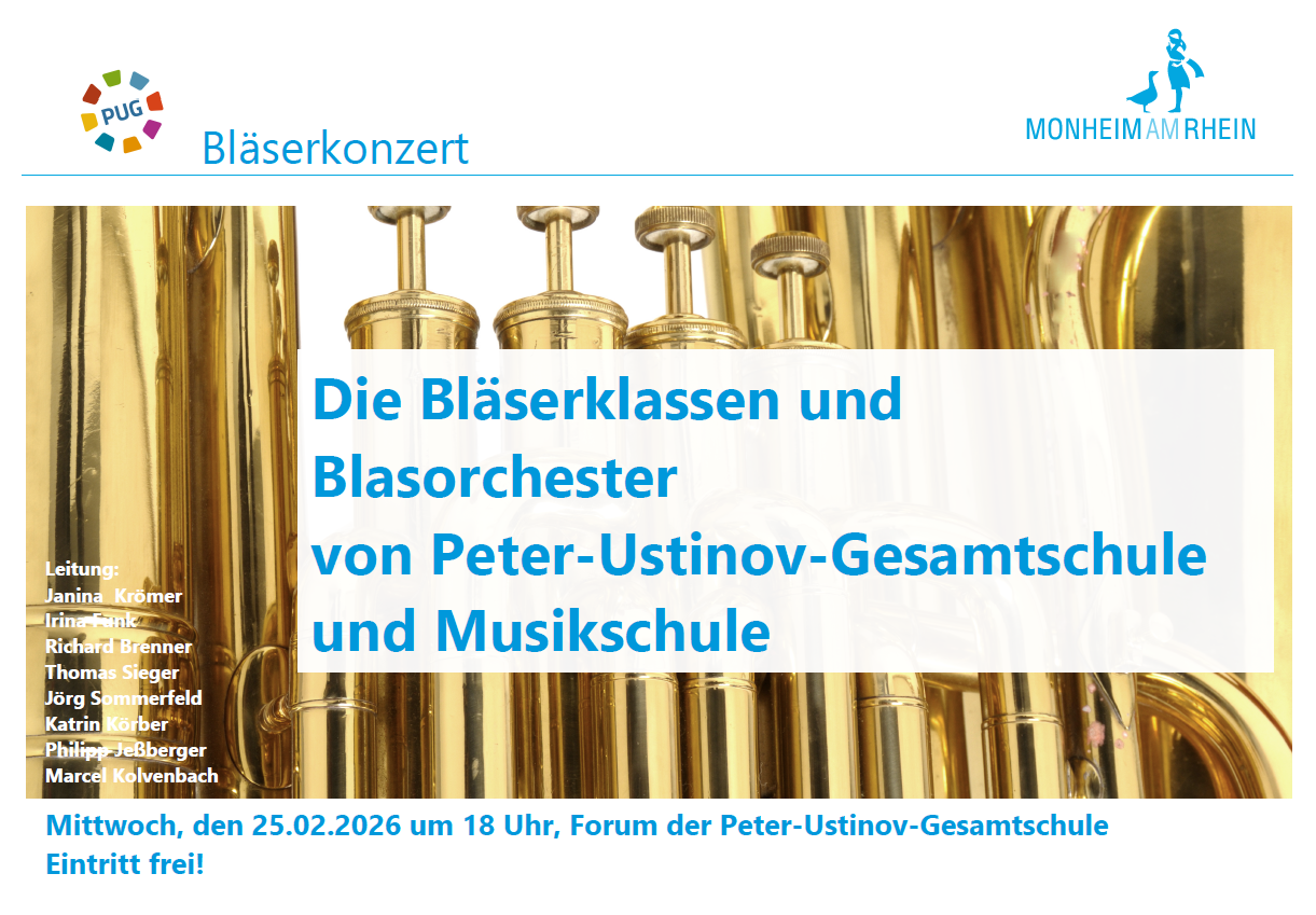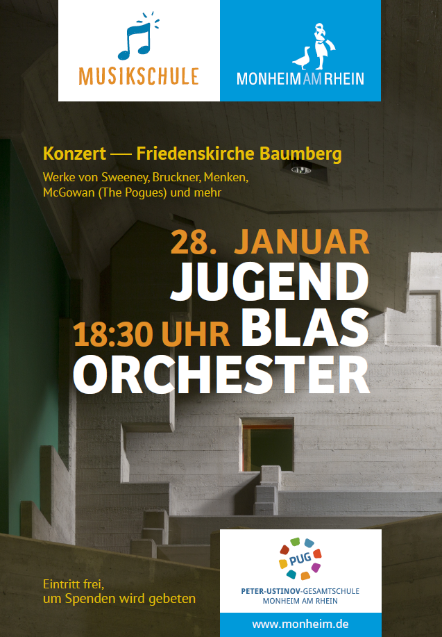 Es musizieren die Bläserklassen 5 und 6, das Kinderblasorchester und das Unterstufenblasorchester. Dem Publikum werden in einem bunten und abwechslungsreichen Programm erste mehrstimmige Kompositionen und Traditionals, Evergreens der klassischen Musik, des Films und Hits der Rock- und Popmusik präsentiert. Zuschauer sind herzlich willkommen, der Eintritt ist frei.