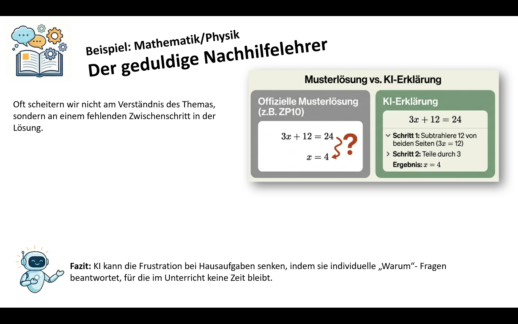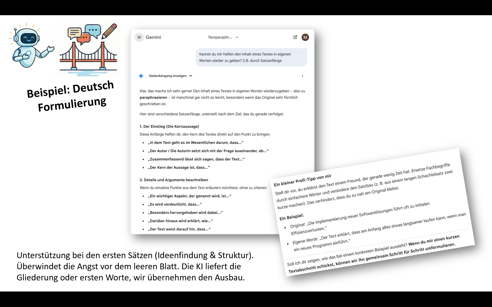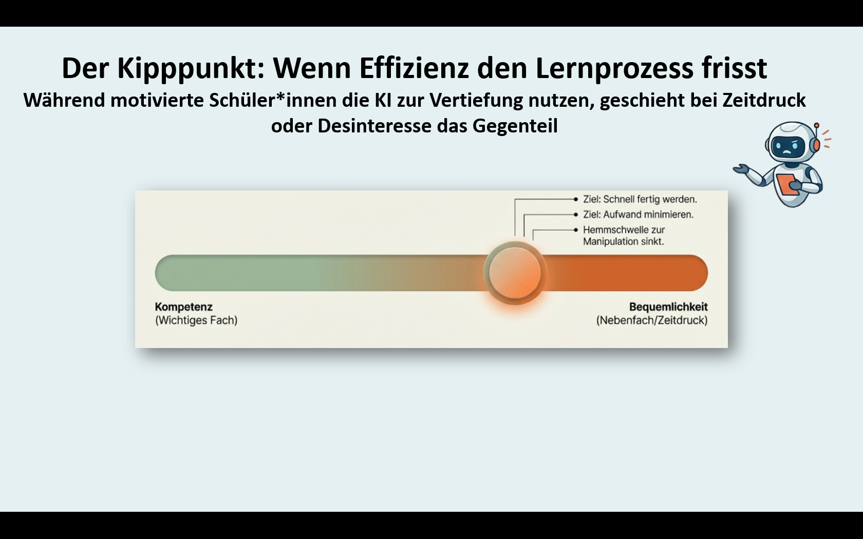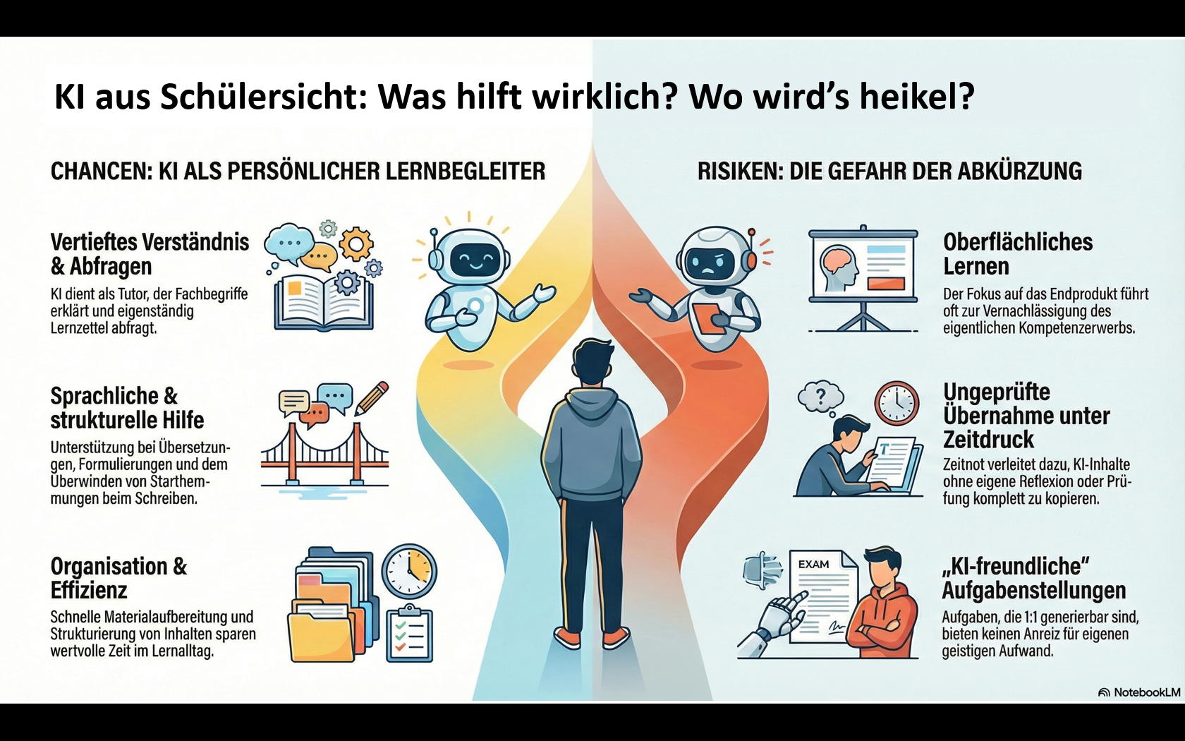 Beim schulinternen Fortbildungstag „KI im Schulalltag: gemeinsam verstehen, gemeinsam gestalten“ hat unsere Medien-AG mit der Barcamp-Session „KI aus Schülersicht: Was hilft wirklich? Wo wird’s heikel?“ für einen besonderen Perspektivwechsel gesorgt. Die Schüler*innen zeigten praxisnah, wie sie KI im Lernalltag nutzen – und wo Fallstricke liegen. Ihre Präsentation (siehe unten) diente als roter Faden und machte deutlich, dass KI im Unterricht vor allem dann ein Gewinn ist, wenn sie gezielt als Lernbegleiter eingesetzt wird: zum Abfragen von Lernzetteln, zum schnellen Klären von Fachbegriffen, zum Ergänzen fehlender Zwischenschritte bei Mathe- und Physikaufgaben, für Übersetzungen und Formulierungshilfen sowie zur Organisation und effizienten Aufbereitung von Lernmaterial. Besonders eindrucksvoll: Die Ehrlichkeit der Schüler*innen – sie haben positive Einsatzbeispiele gezeigt und offen gemacht, wann sie KI aus Bequemlichkeit als Abkürzung genutzt haben und was sie heute anders machen würden. Die Rückmeldungen aus dem Kollegium waren durchweg positiv: Besonders geschätzt wurden die Klarheit, Ehrlichkeit und Praxisnähe der Darstellung. Viele Lehrkräfte nahmen konkrete Anregungen mit, wie Aufgaben so gestaltet werden können, dass sinnvoller KI‑Einsatz möglich ist. Das gemeinsame Fazit fasst den Tag treffend zusammen: „KI verbieten funktioniert nicht. Die Aufgaben müssen sich ändern.“ Als Schule müssen wir daher auf Aufgabenformate mit Zwischenschritten und Reflexion, klare Regeln zur Kennzeichnung von KI‑Nutzung, altersangemessene Kompetenzziele und datensichere, pädagogisch sinnvolle Tools setzen. Ein herzliches Dankeschön an unsere Medien‑AG und an das Kollegium für den offenen, konstruktiven Dialog – ein wichtiger Schritt, KI im Schulalltag verantwortungsvoll und lernwirksam zu gestalten.